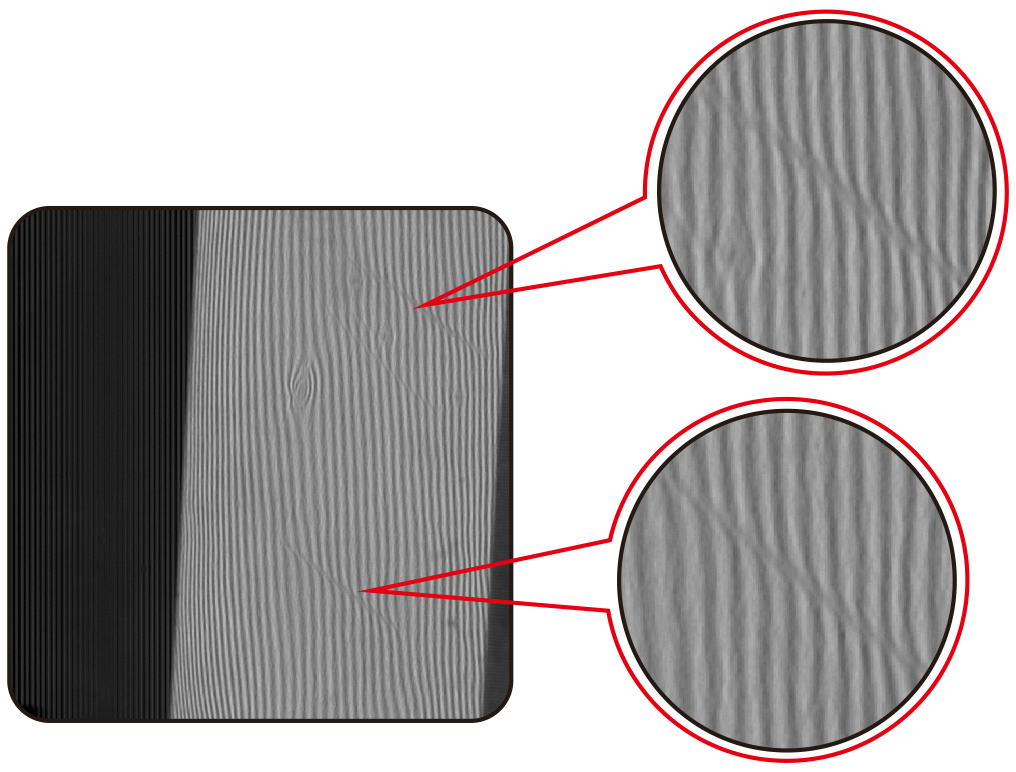 說(shuō)明:對(duì)于光滑表面的凹凸點(diǎn),通過(guò)判斷條紋的彎曲很容易找出缺陷位置,放大缺陷。線(xiàn)陣檢測(cè)面積大,可根據(jù)樣品的大小選擇相對(duì)大的光源來(lái)滿(mǎn)足視野的,均勻性相對(duì)面陣更有優(yōu)勢(shì)。