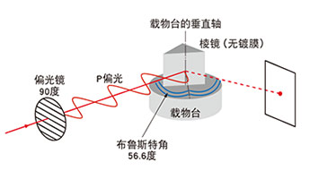 入射單色光源通過偏光鏡,邊轉動偏光鏡邊觀察從棱鏡反射的光的強度變化。如果,入射角度符合布魯斯特角度(56.6度),反射光消失的位置為偏光軸方向。