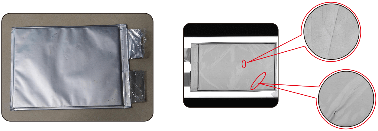 成品汽車動力鋰電池面積大,多推薦采用線掃視覺方案。針對光滑表面存在的不定向劃痕、折皺檢測要求,通常采用均勻光源照射,配合線掃相機成像。打光時常用隧道線光源組合同軸線光源,使缺陷突出便于圖像分析。