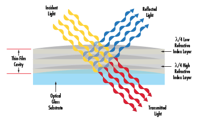 由于多層膜的各層薄膜的相對厚度,在射入傾斜光線時,光線通過薄膜中的光程會變長。因此,入射角度為0度(垂直)時,波長特性在最長波長一側(cè),入射角度變大時,向較短波長一側(cè)移動。