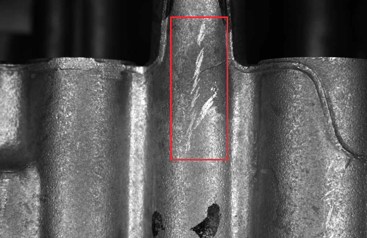 鑄造件表面為磨砂,有缺陷的位置是光滑的,沙眼會(huì)呈現(xiàn)黑色。因鑄造件都是大件,一次很難做到全檢,需機(jī)械手移動(dòng)光源相機(jī)多次檢測(cè),使用環(huán)形無(wú)影光源,可良好凸顯其缺陷。