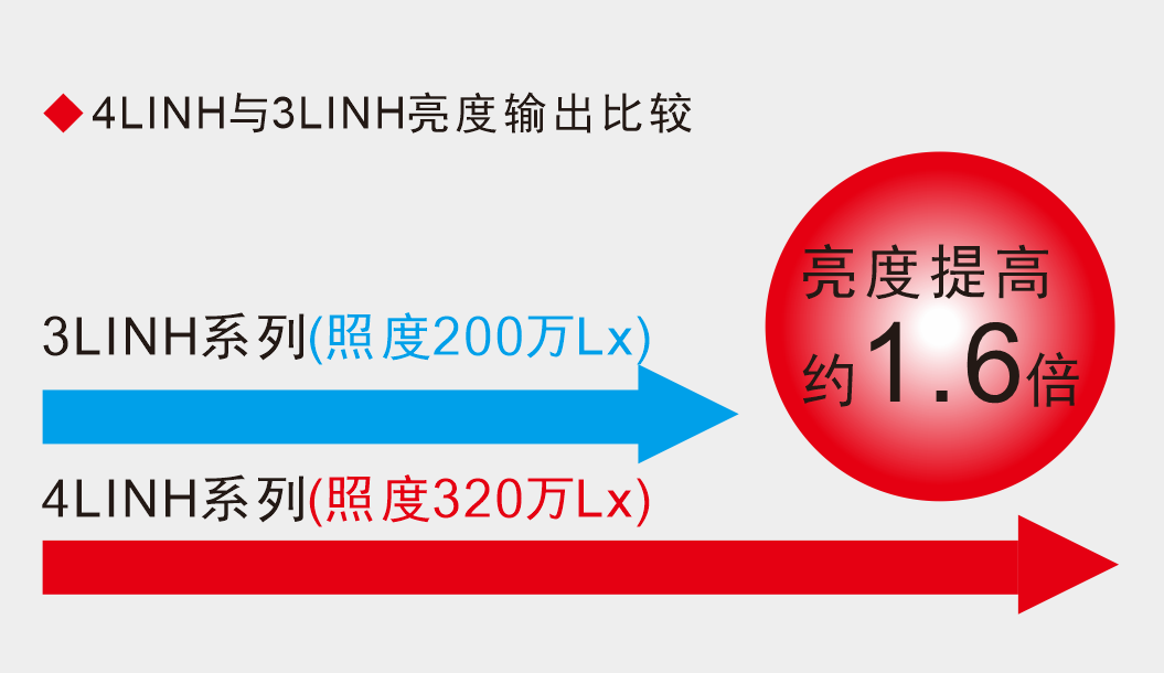 4LINH是樂視科技最新研發(fā)的第4代超高亮線光源,采用高亮LED及獨特光學(xué)設(shè)計,相對于3LINH系列,照度提升1.6倍,重量減輕35%,體積減小20%,可7x24小時工作,照度可達到320萬Lx。