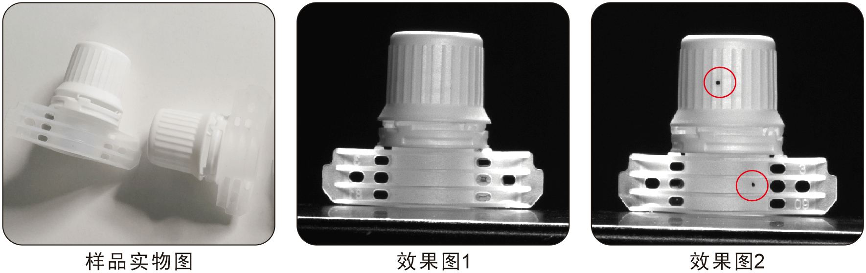 兒童飲料吸嘴蓋要求非常高,不僅是衛(wèi)生方面,本身產(chǎn)品材質(zhì)也是非常有講究,對(duì)于視覺檢測只需檢測其中臟污、瑕疵等特征。因?yàn)槲煨枰?60度一整圈全檢,所以這也增加了檢測難度,此項(xiàng)目采用采用雙相機(jī)在側(cè)面每次1/2拍攝面,條形光源在正上方稍做傾斜拍攝,這也既保持低角度類型表面檢測,也能盡可能的增大均勻的照射面積。