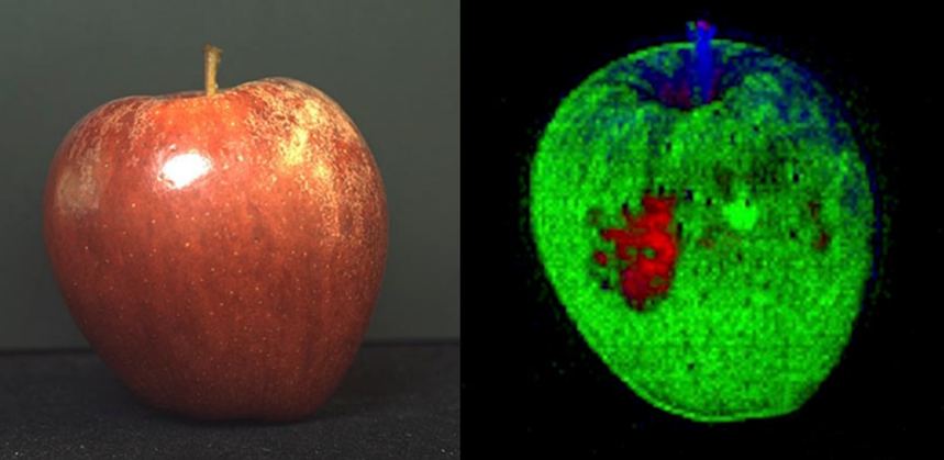 近紅外(NIR)波段范圍從700nm延伸到1μm。傳統的CMOS傳感器具有一定的NIR靈敏度,而在850nm以上具有增強靈敏度的版本正變得越來越普遍。NIR可以揭示水果、蔬菜、堅果和肉類等食物中的腐爛、機械損傷和蟲害等非表面特征。NIR照明還可以穿透某些染料和油墨,從而可以通過印刷包裝檢查產品。在木材、紡織、紙張、玻璃、瓷磚和電子工業中也有應用,并用于檢查圓柱形物品(如罐頭、瓶子、鋼筆等)甚至旋轉物體上的標簽。