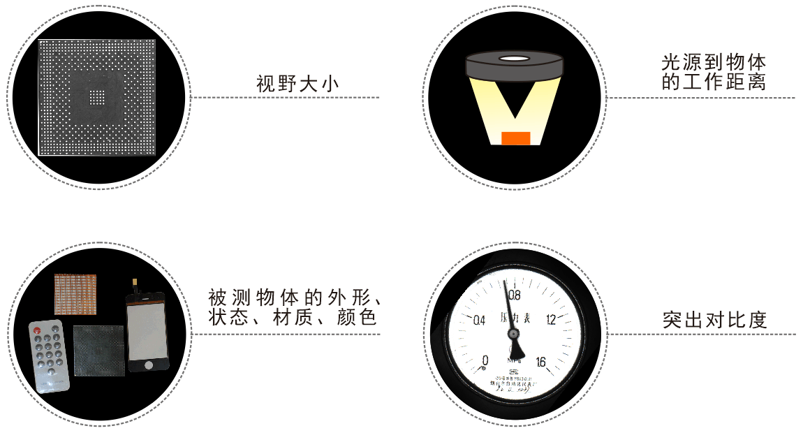 針對具體的應用,從眾多的方案中選擇一個最好的照明系統是整個圖像處理系統穩定工作的關鍵。但目前沒有一個通用的照明系統能夠適應各種場合,根據LED光源多形狀,多顏色等特點,我們總結出一些選型光源的方法: