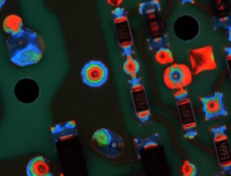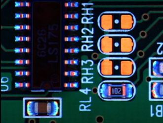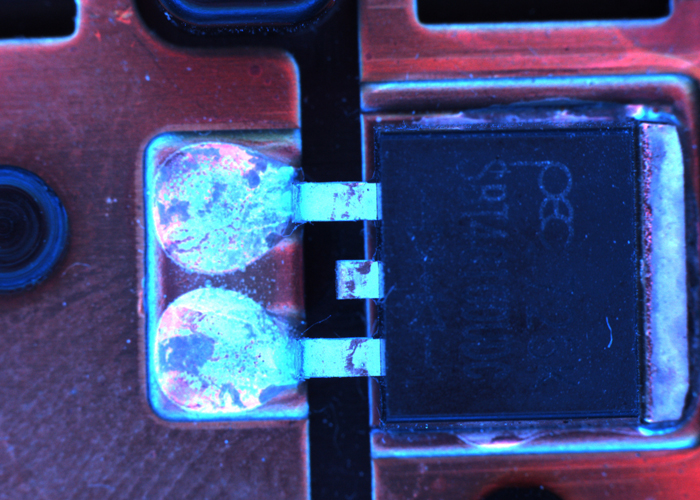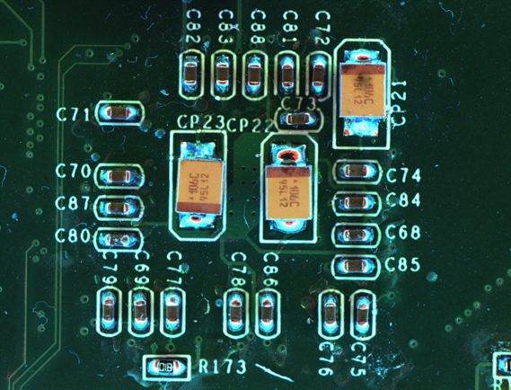 說明:PCB板上的焊錫缺陷,利用AOI光源RGB不同顏色的光打出不同的角度可以使,缺陷部分顏色特征突出。