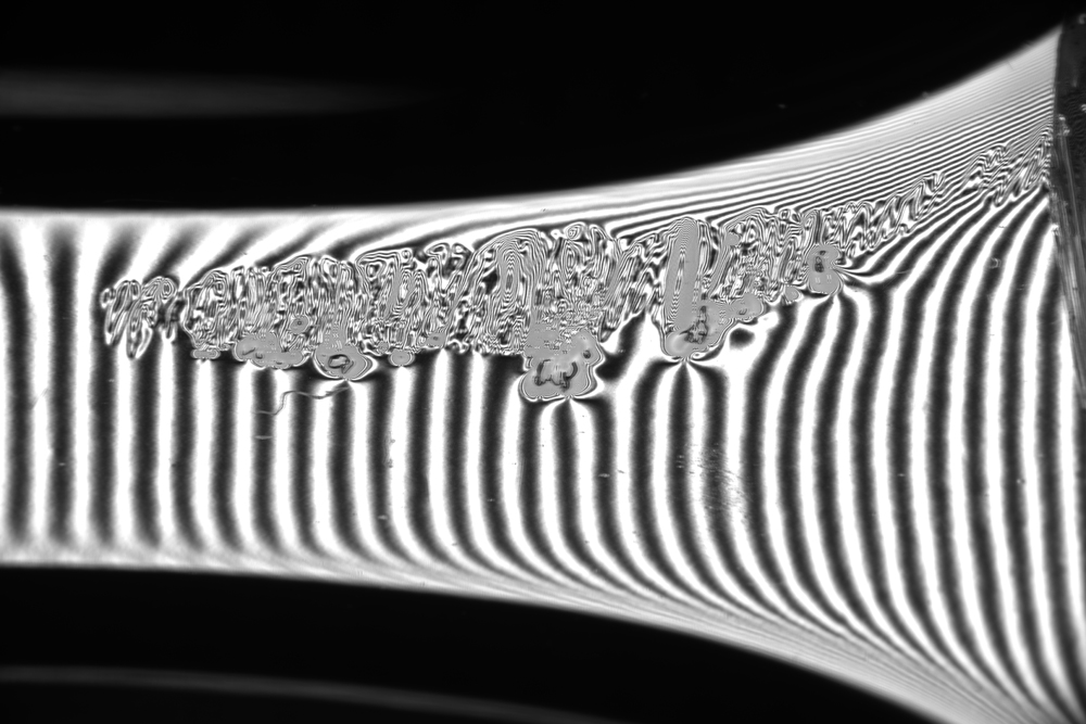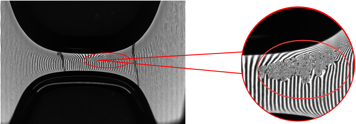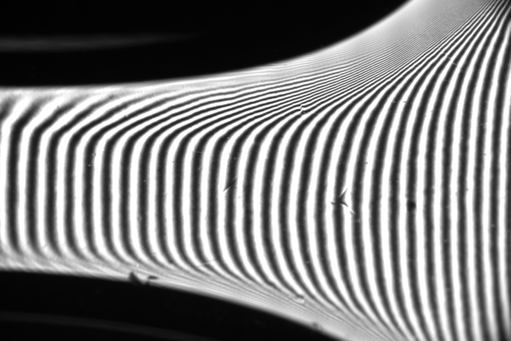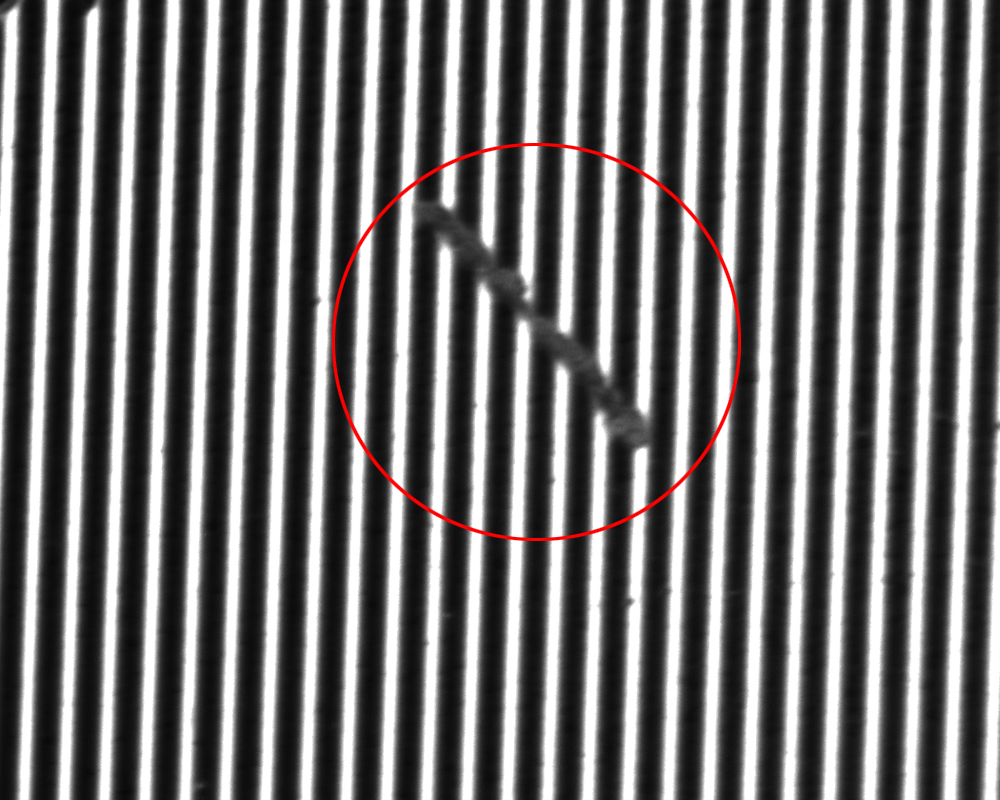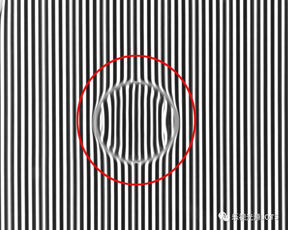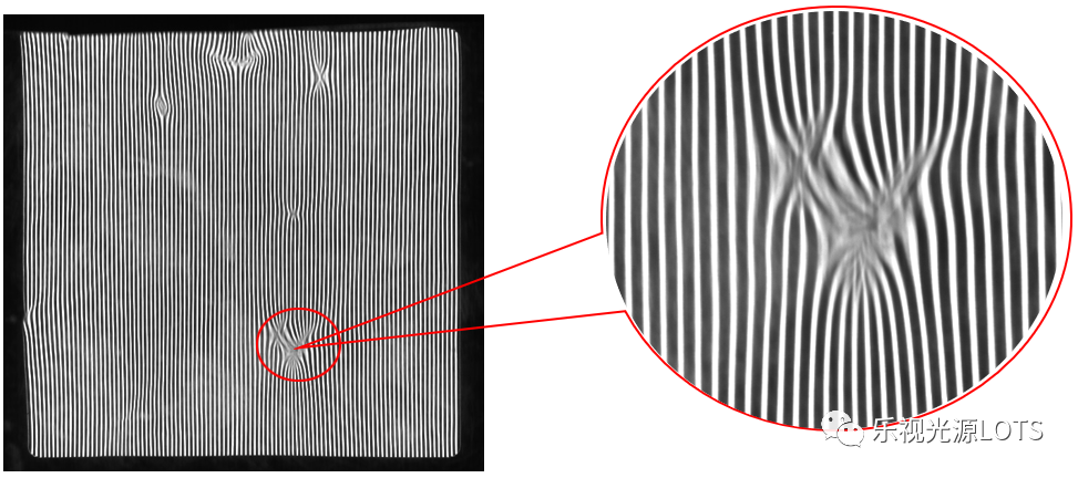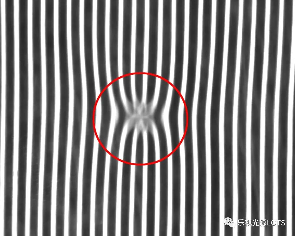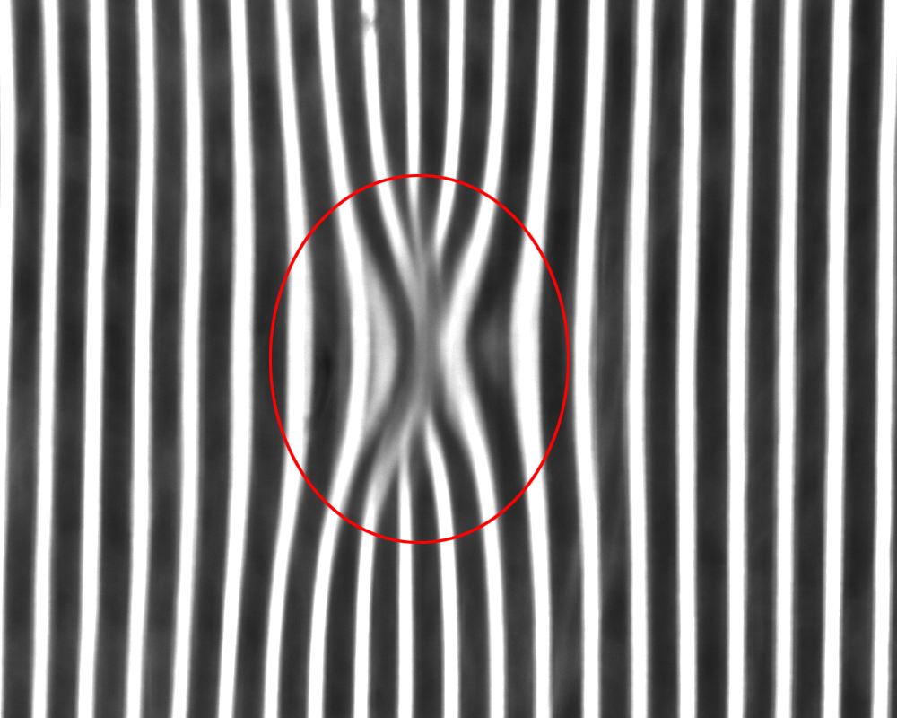 說明:對于光滑表面的凹凸點,通過判斷條紋的彎曲輕松找出同缺陷位置。