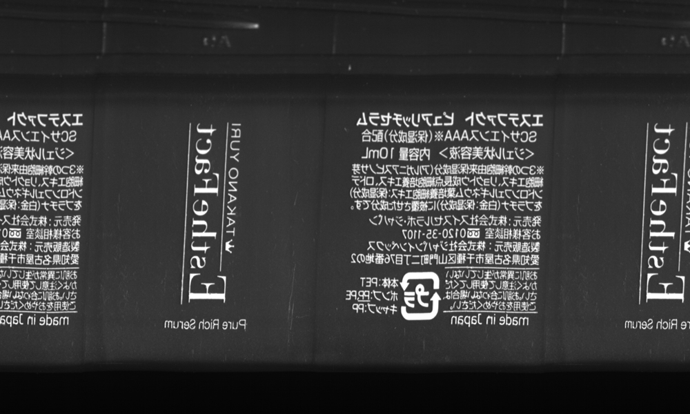 產品是圓柱結構且光滑反光,由于產品為透明材質,底部字符會對上表面字符形成干擾,所以光源采用線光源低角度拍攝,線陣相機配旋轉滾筒平臺,成像效果非常好。