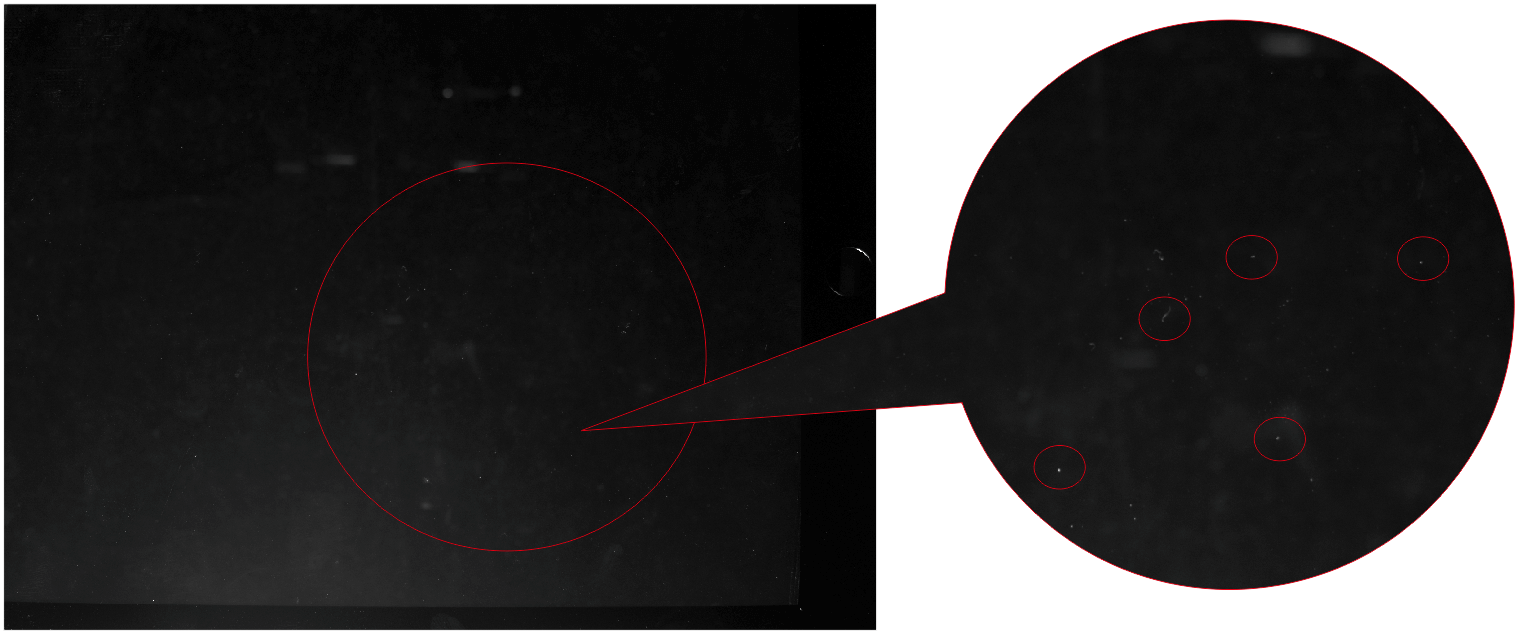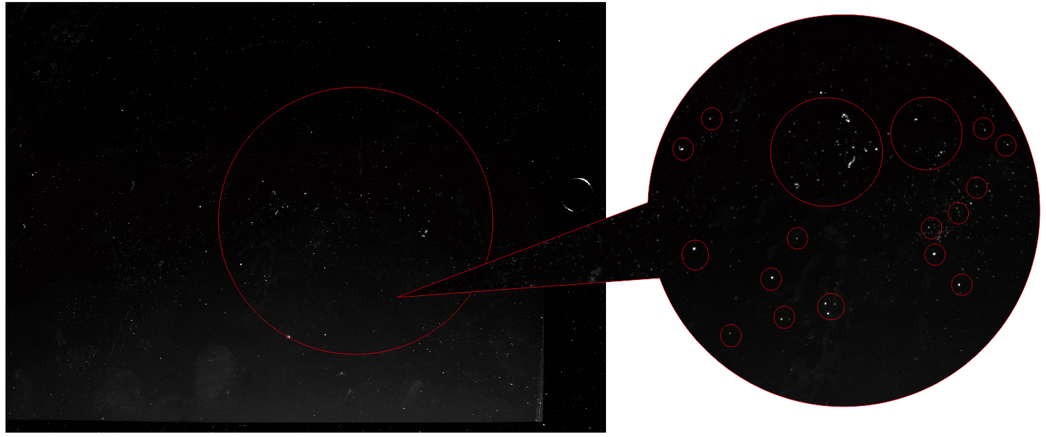 從效果圖上看迷你線光源3LINR220-W照射的灰塵顆粒要多,而且與實際面積大小相符,對應的檢測精度要高;條形光源4BR15030-W只能檢測大灰塵顆粒,與實際面積對比有所差異。具體效果如下圖所示: