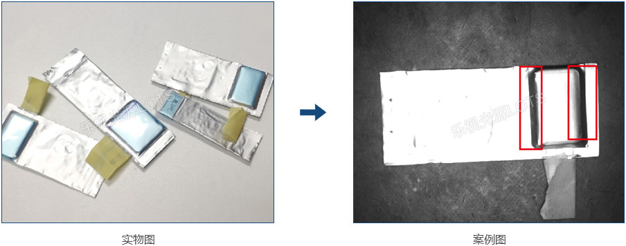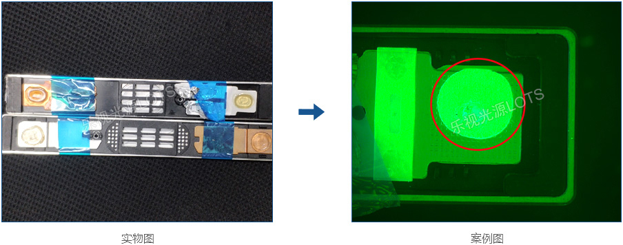 檢測汽車鋰電極耳上透明膠水點膠的面積,常規光源無效果,使用紫外環形光,配合光學濾鏡,膠水的輪廓邊清晰對比明顯。