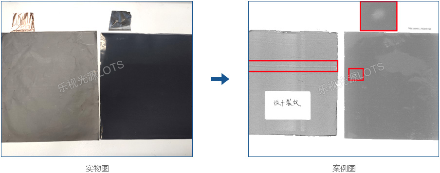 檢測兩種鋰電極片表面各種缺陷,一種光滑面容易反光另一種磨砂面的,兼容兩種極片使用隧道線光源,各種特征對比明顯。
