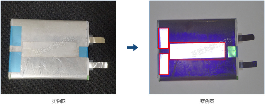 檢測電池表面透明膜與藍色膜所貼的位置,采用高角度光源配合光學配件偏振鏡,偏振光使膜與背景的對比非常明顯。