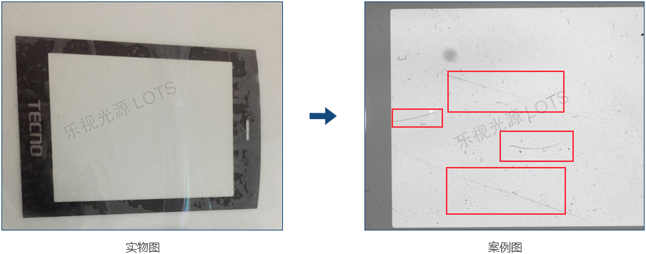 屏幕顯示層有異物、缺口、多料情況,在膜內部檢測出缺陷,需要考慮到膜的干擾,使用四條組合條光凸顯出缺陷位置,低角度用光排除其他干擾。