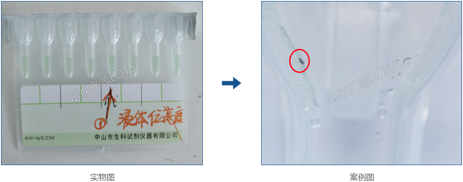 使用彩色相機,條形光側面低工作距離打光,在試劑不會產生反光影響檢測的情況下,黑色雜質清晰。